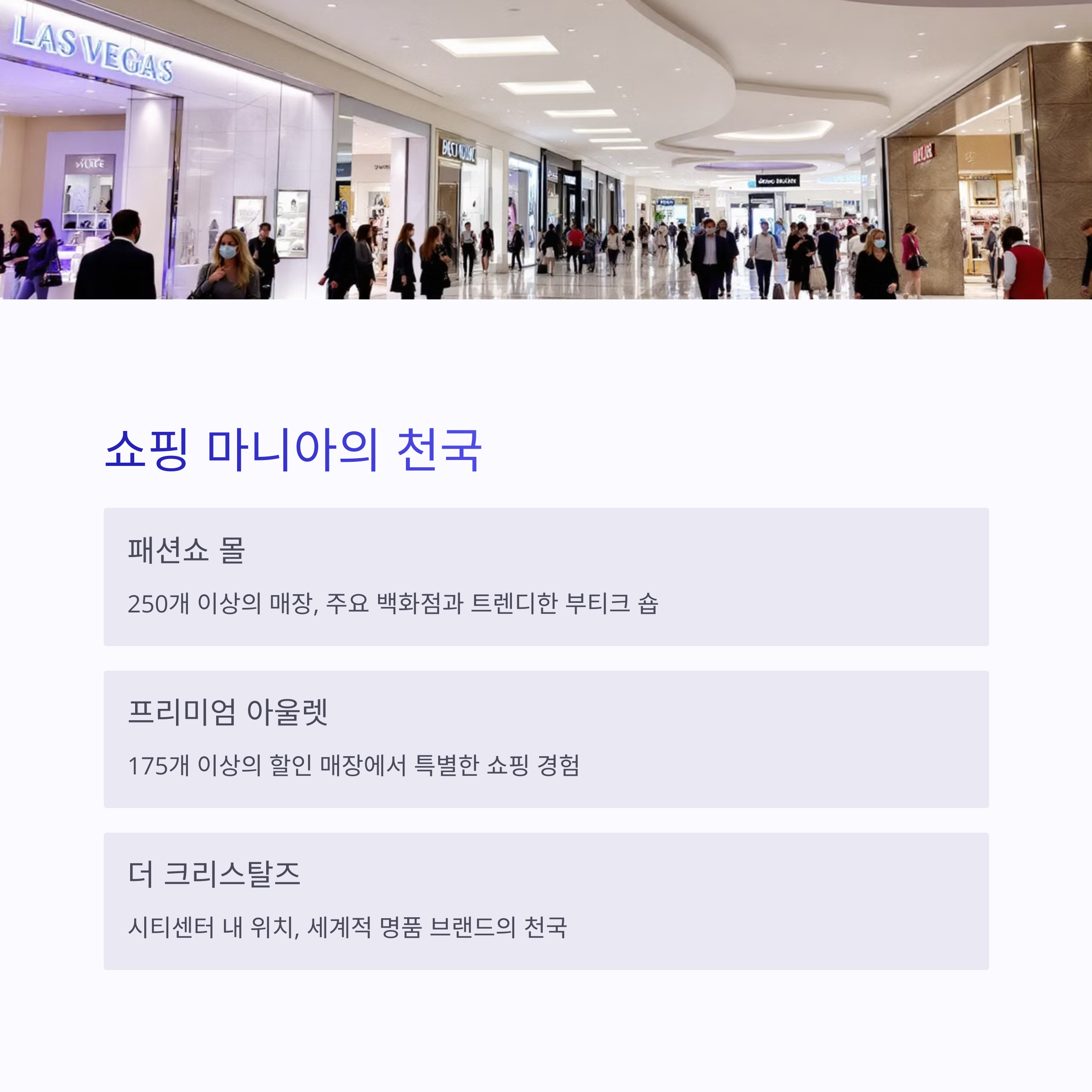 쇼핑 마니아라면 라스베이거스에서 절대 놓칠 수 없는 명소들이 있습니다. 패션쇼 몰은 최신 트렌드를 반영한 다양한 브랜드를 한 자리에서 만날 수 있는 곳이며, 프리미엄 아울렛은 할인율이 높아 합리적인 가격에 명품을 구매할 수 있는 곳으로 인기가 많습니다. 특히, 더 크리스탈즈 앳 시티센터는 하이엔드 명품 매장이 모여 있어 럭셔리 쇼핑을 원하는 분들에게 추천합니다.