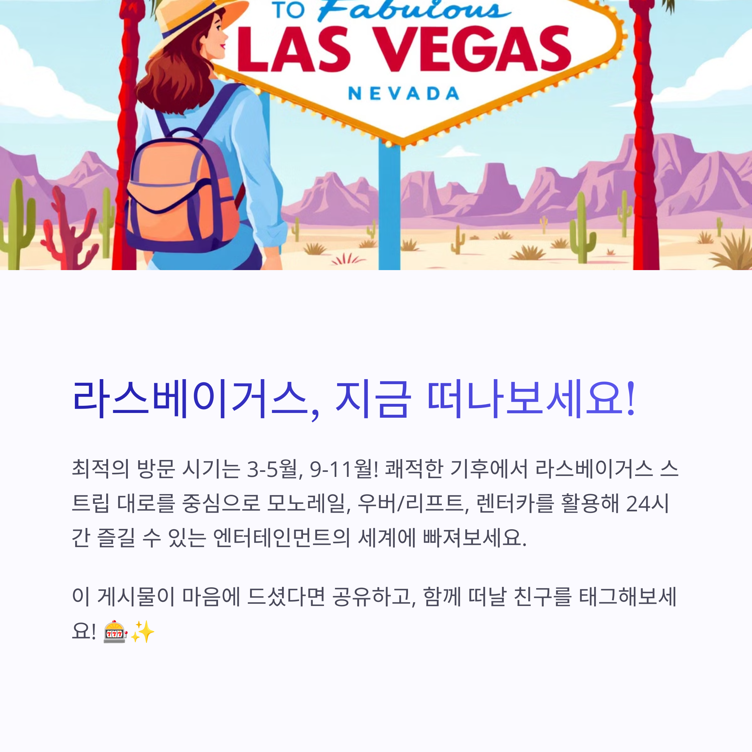 라스베이거스를 방문해 본 적이 있나요? 여러분이 가장 추천하는 명소는 어디인가요? 댓글로 공유해 주세요!