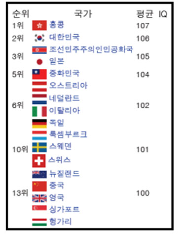 전 세계 평균 IQ는 100이며, 한국의 평균은 약 106입니다.