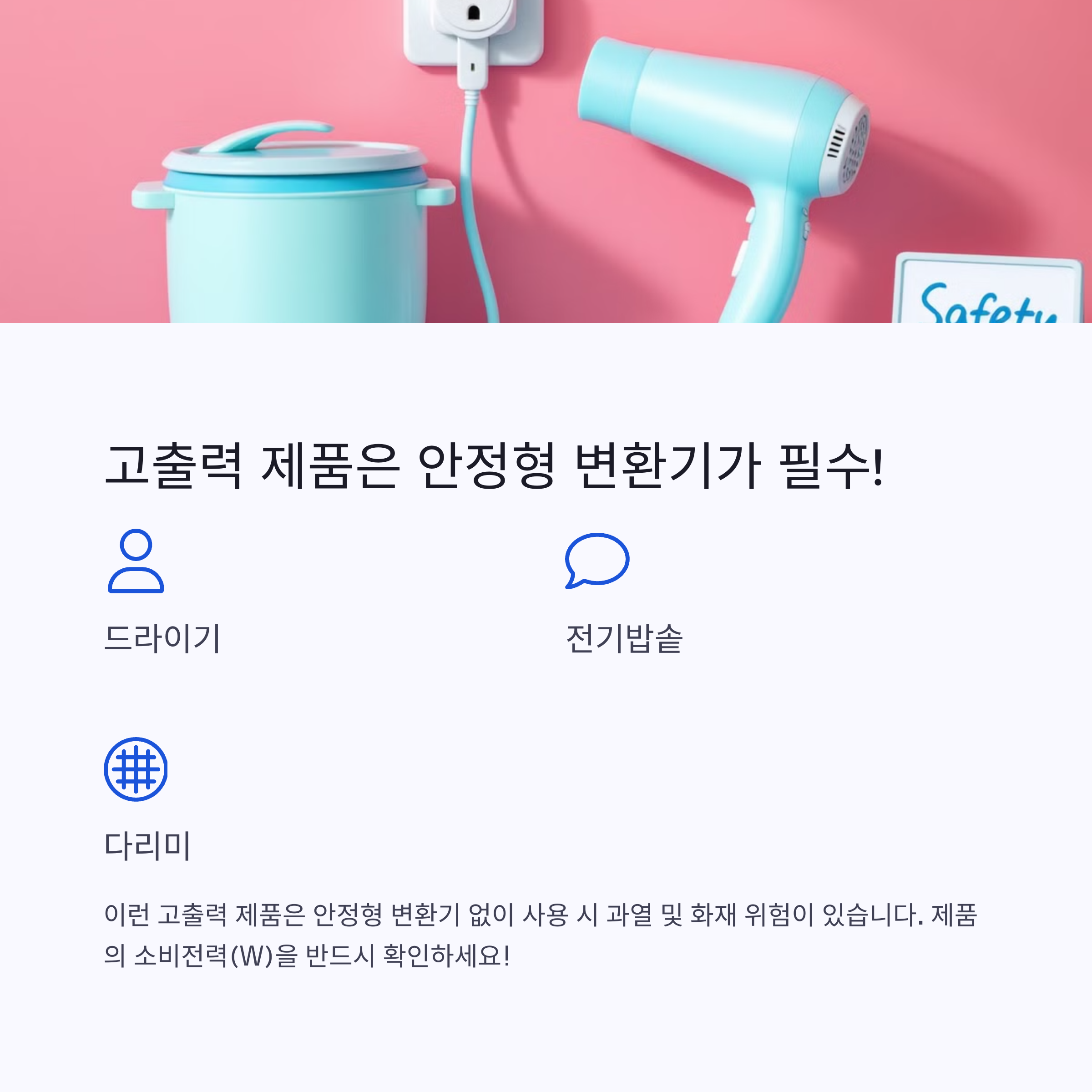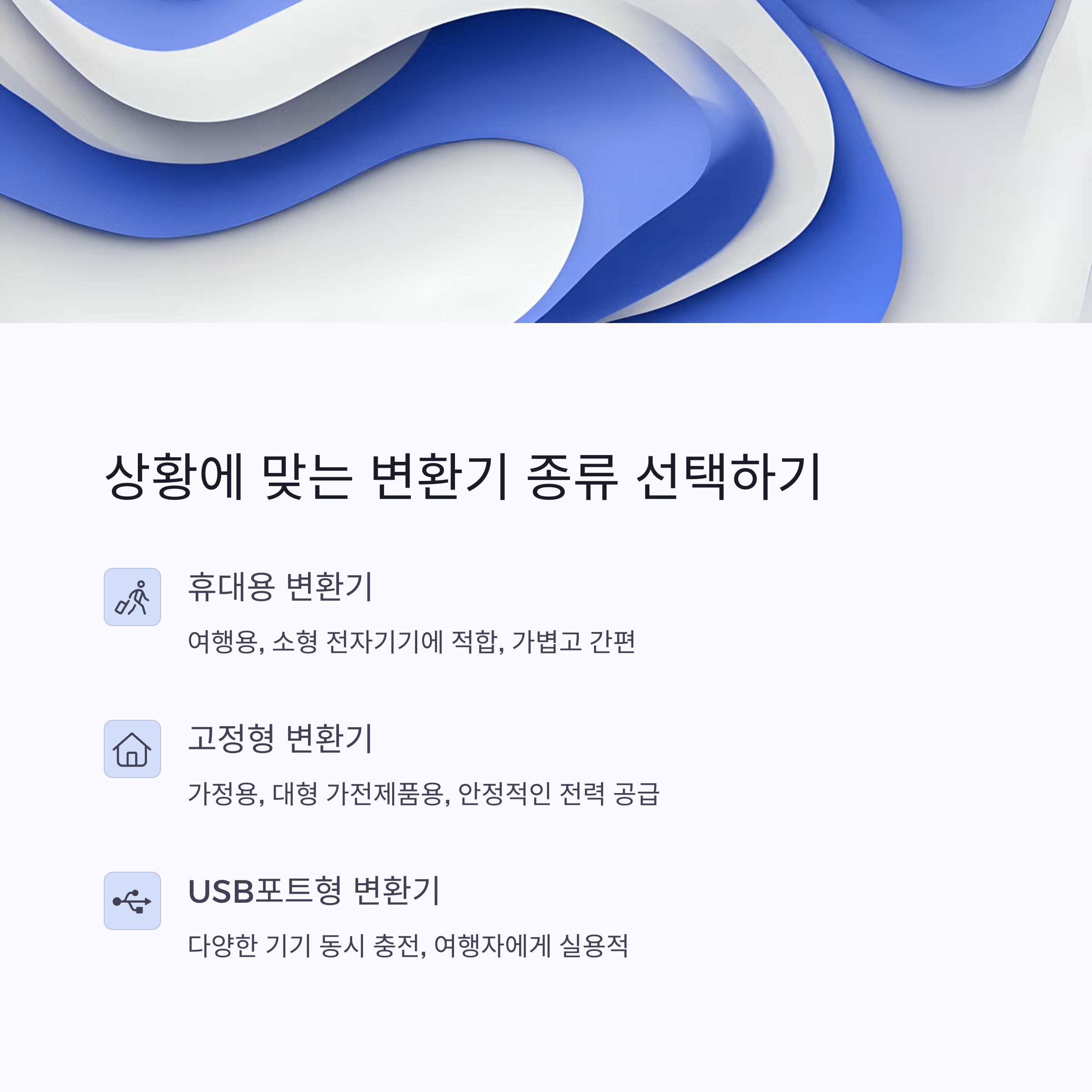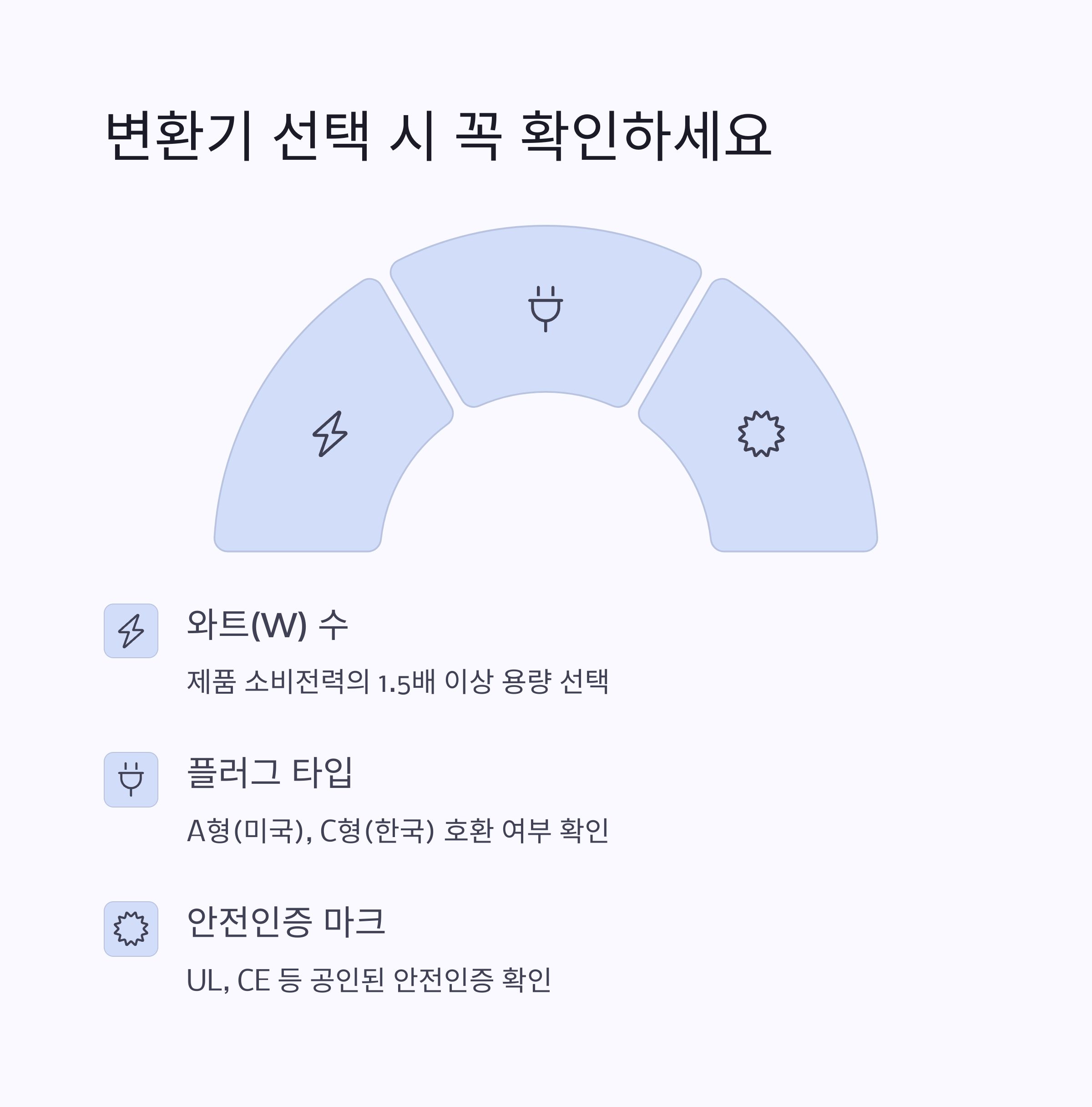 | 110V, 60Hz 사용. 플러그는 A, B형 | 일반형, 안정형, USB 내장형 등 다양함 | 용도, 와트 수, 휴대성 기준으로 선택 |