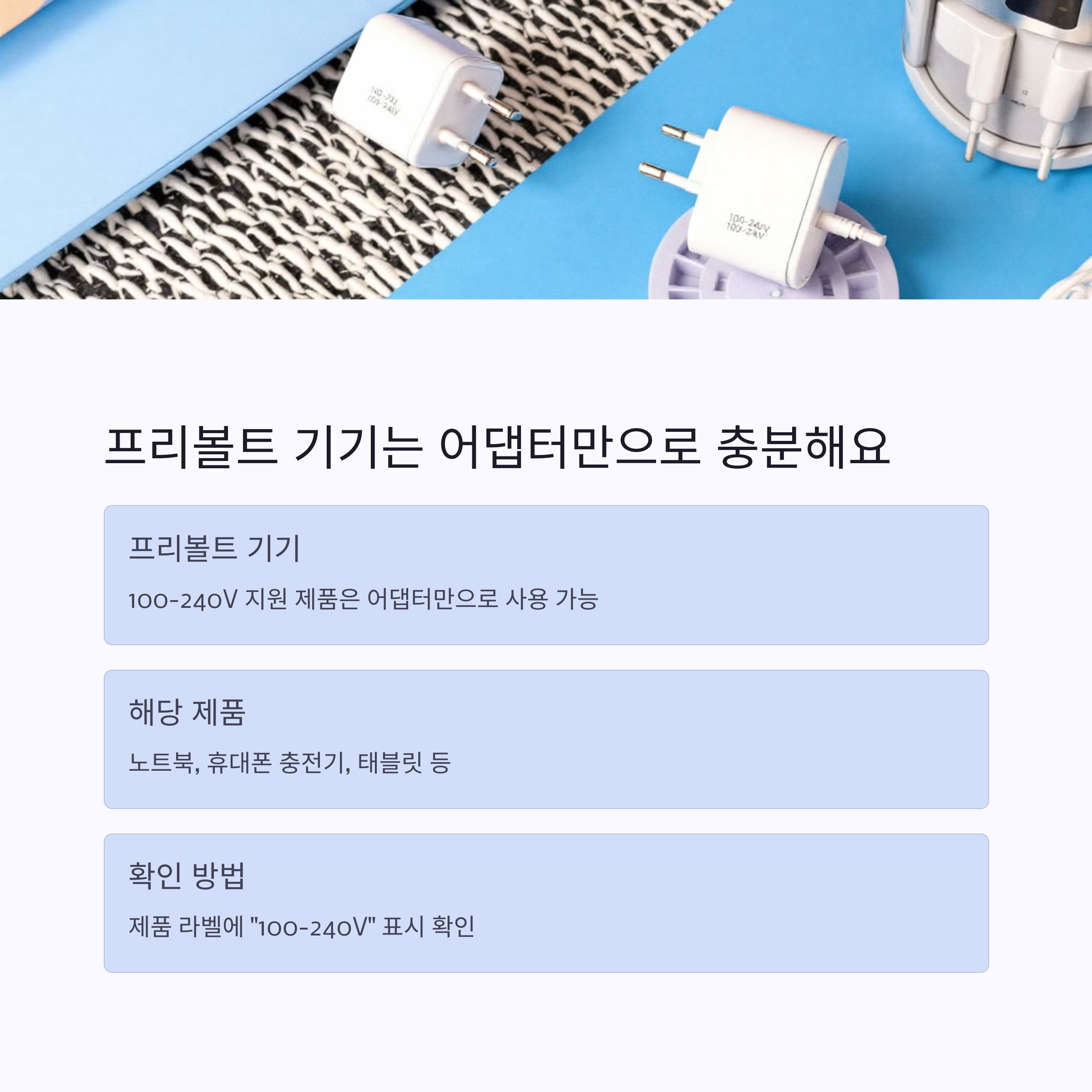 | 전압 호환 확인 | 100~240V 지원 기기는 변환기 없이도 사용 가능해요. |