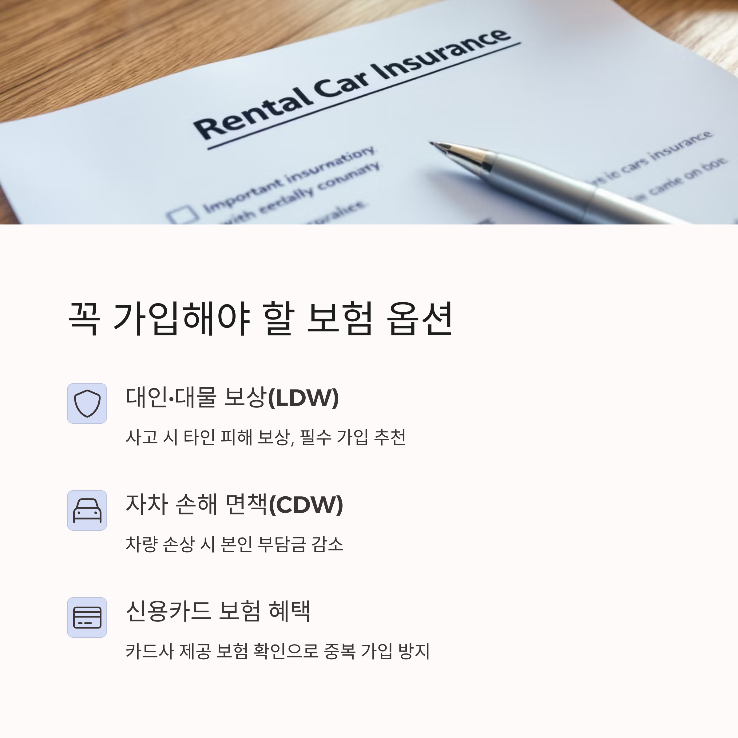 | 렌터카 업체 | 보험 옵션 | 차량 체크 리스트 |