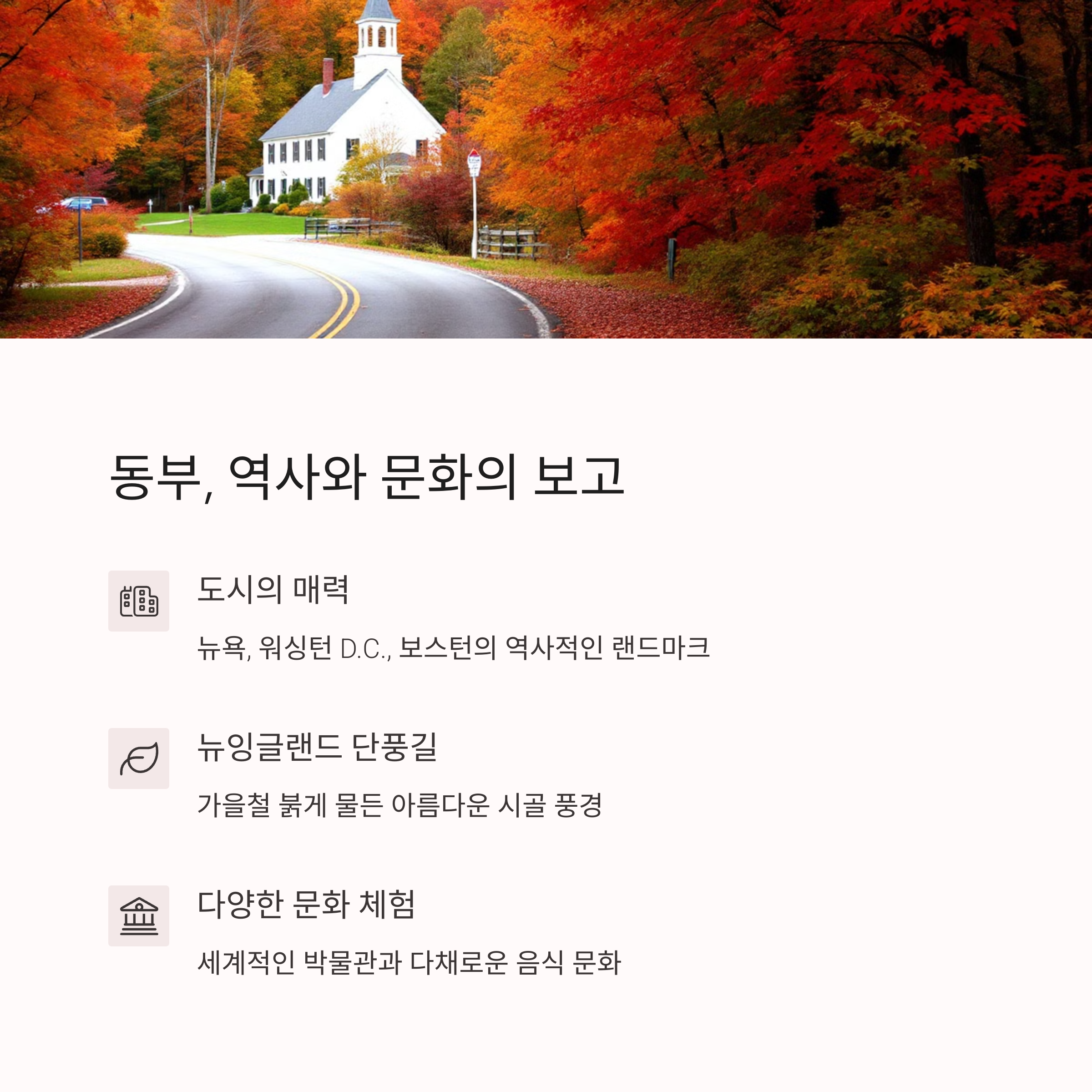 | 동부 로드트립 | 역사적인 도시와 아름다운 단풍길을 따라가 볼 수 있어요! |