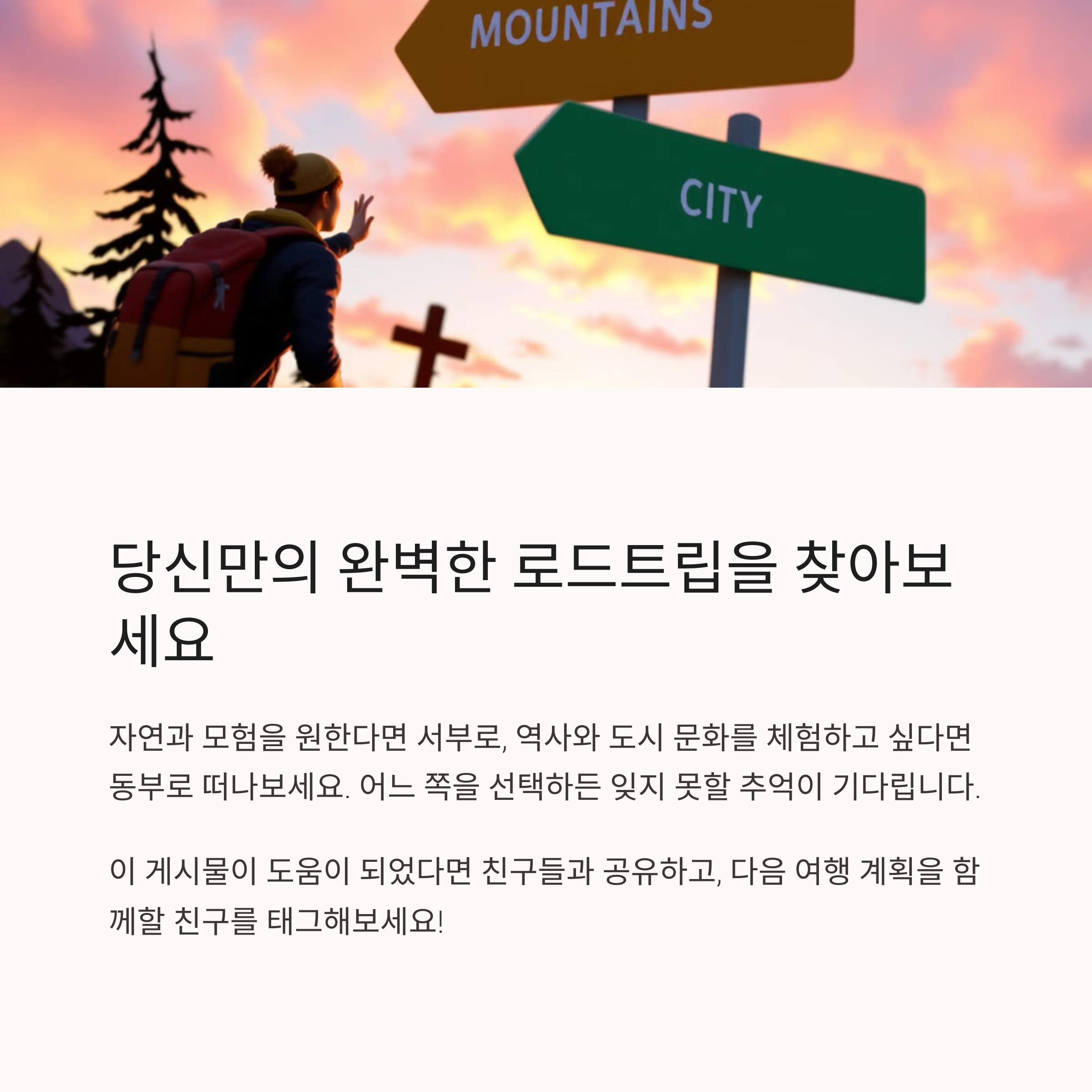 서부와 동부 모두 각기 다른 매력이 있습니다. 자연을 좋아한다면 서부, 도시 탐방을 선호한다면 동부가 적합하죠. 여행 스타일에 따라 적절한 루트를 선택하면 최고의 로드트립을 경험할 수 있습니다. 여러분은 어디로 떠나고 싶으신가요?