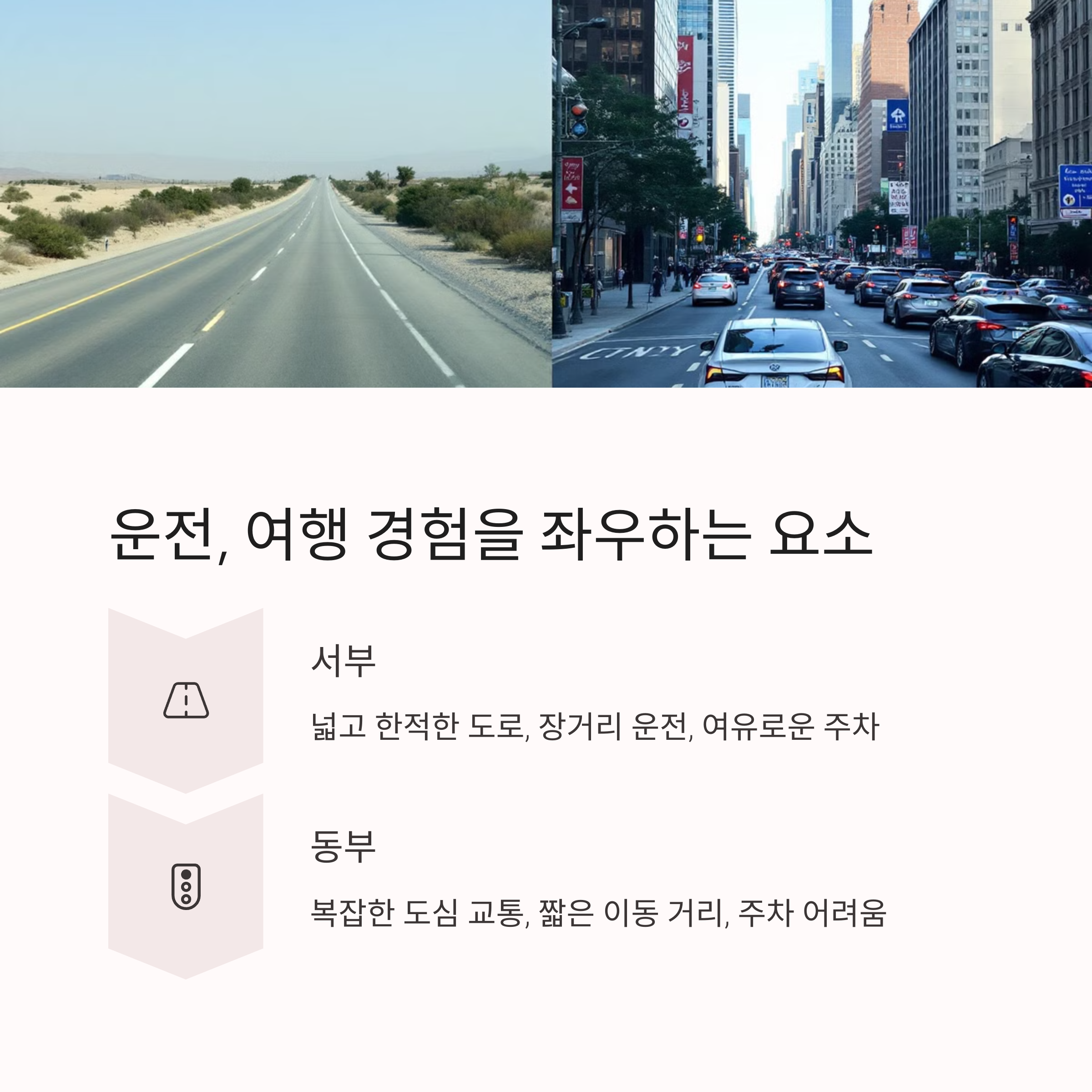서부는 긴 직선 도로가 많아 운전이 비교적 수월한 반면, 동부는 도심이 많아 교통이 복잡할 수 있습니다. 초보 운전자라면 서부를 추천합니다!