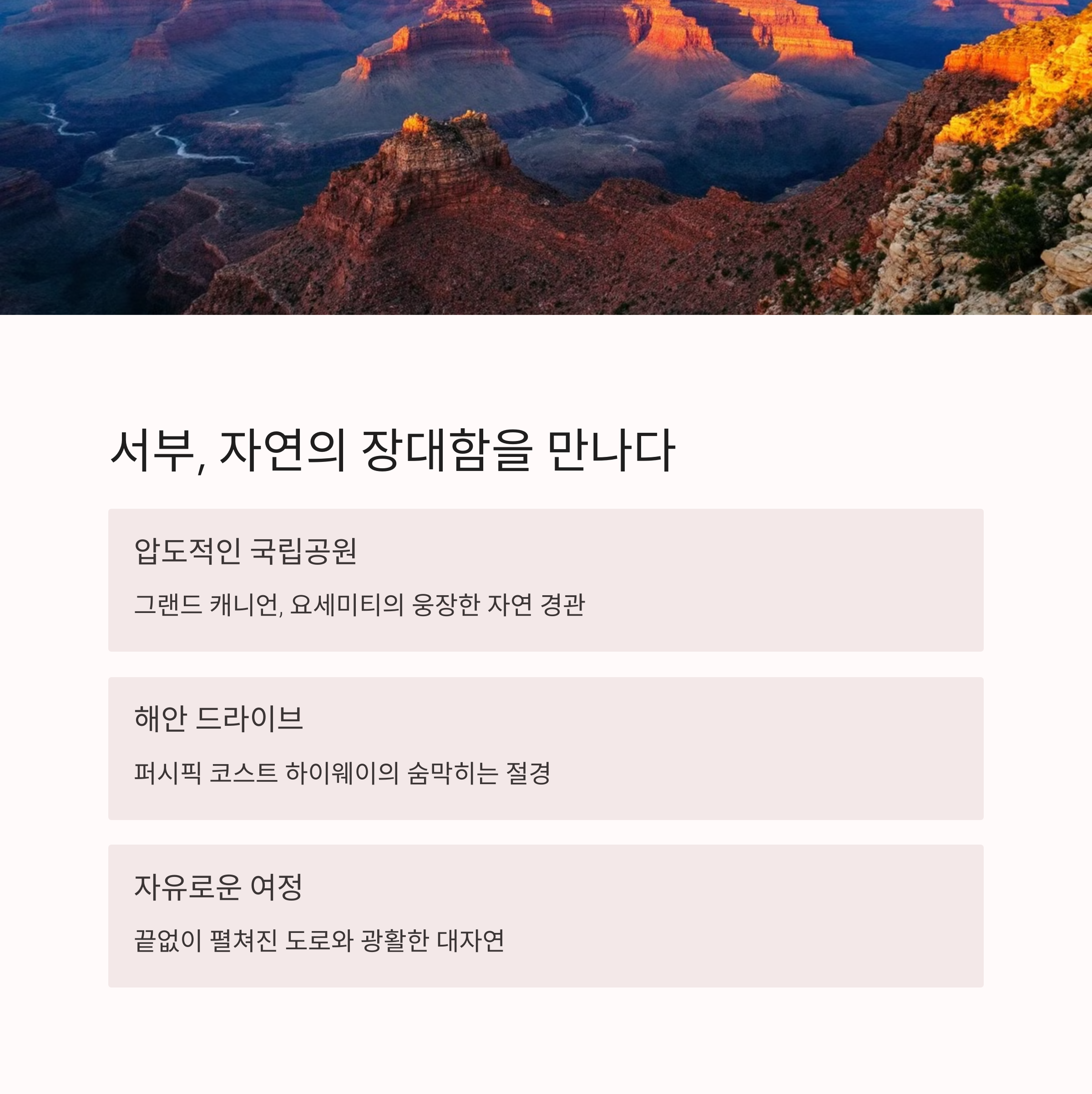 | 서부 로드트립 | 광활한 국립공원과 드넓은 사막을 경험할 수 있어요! |
