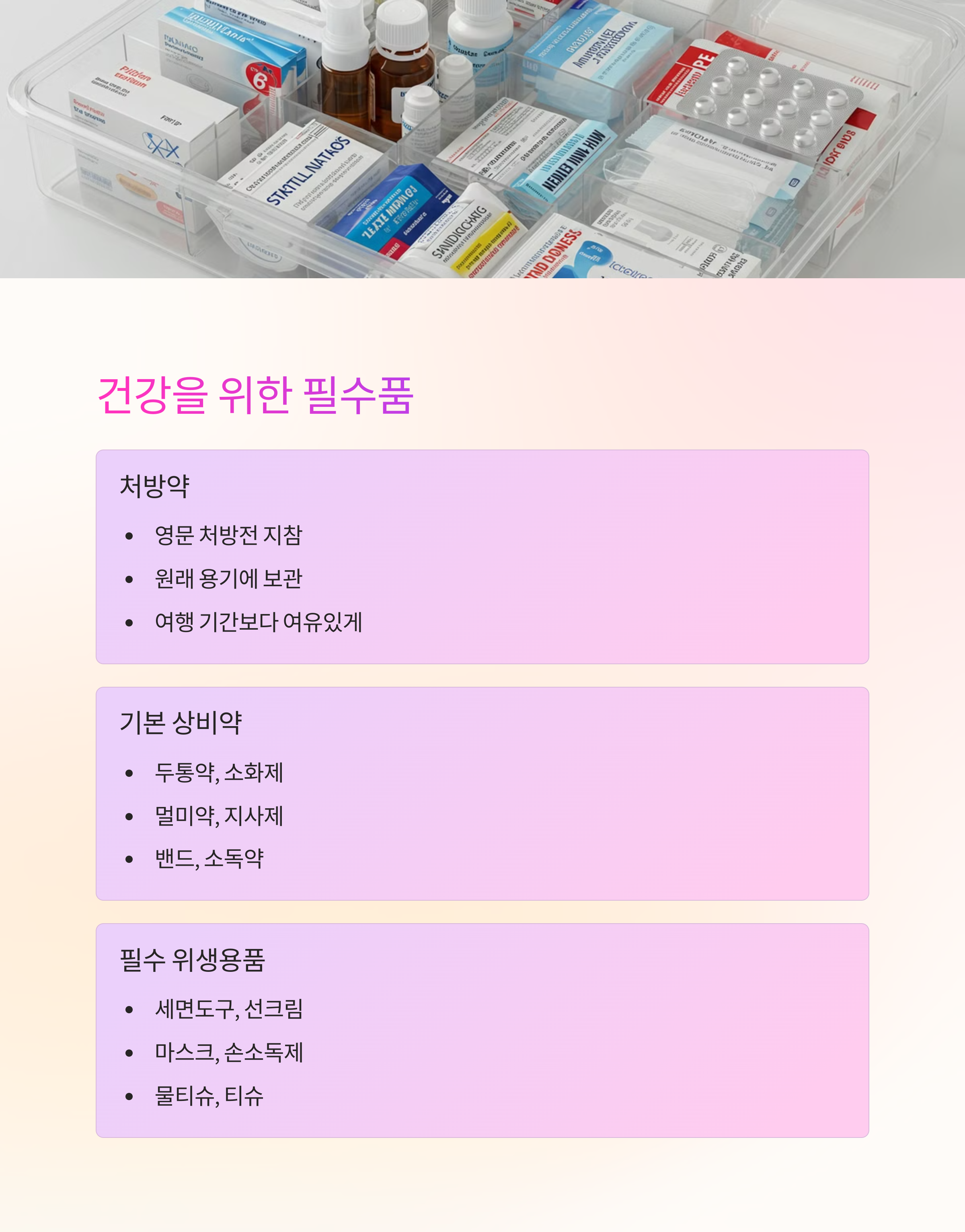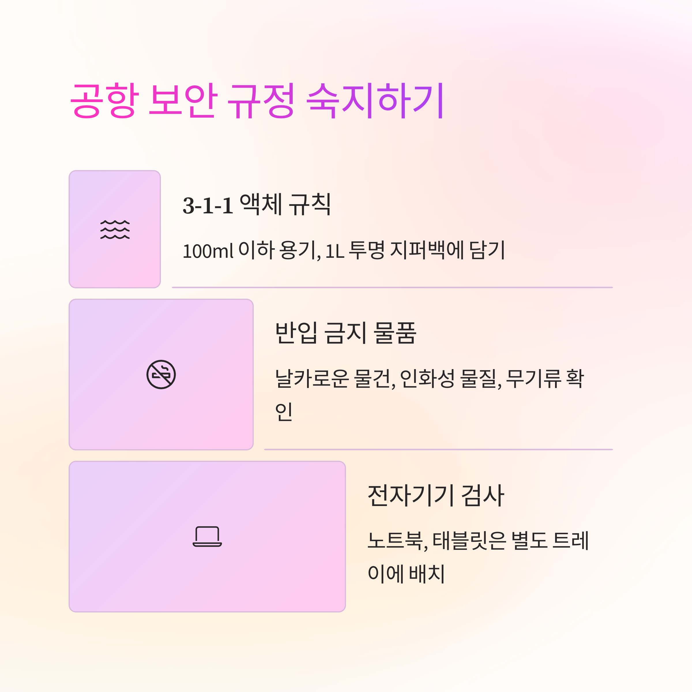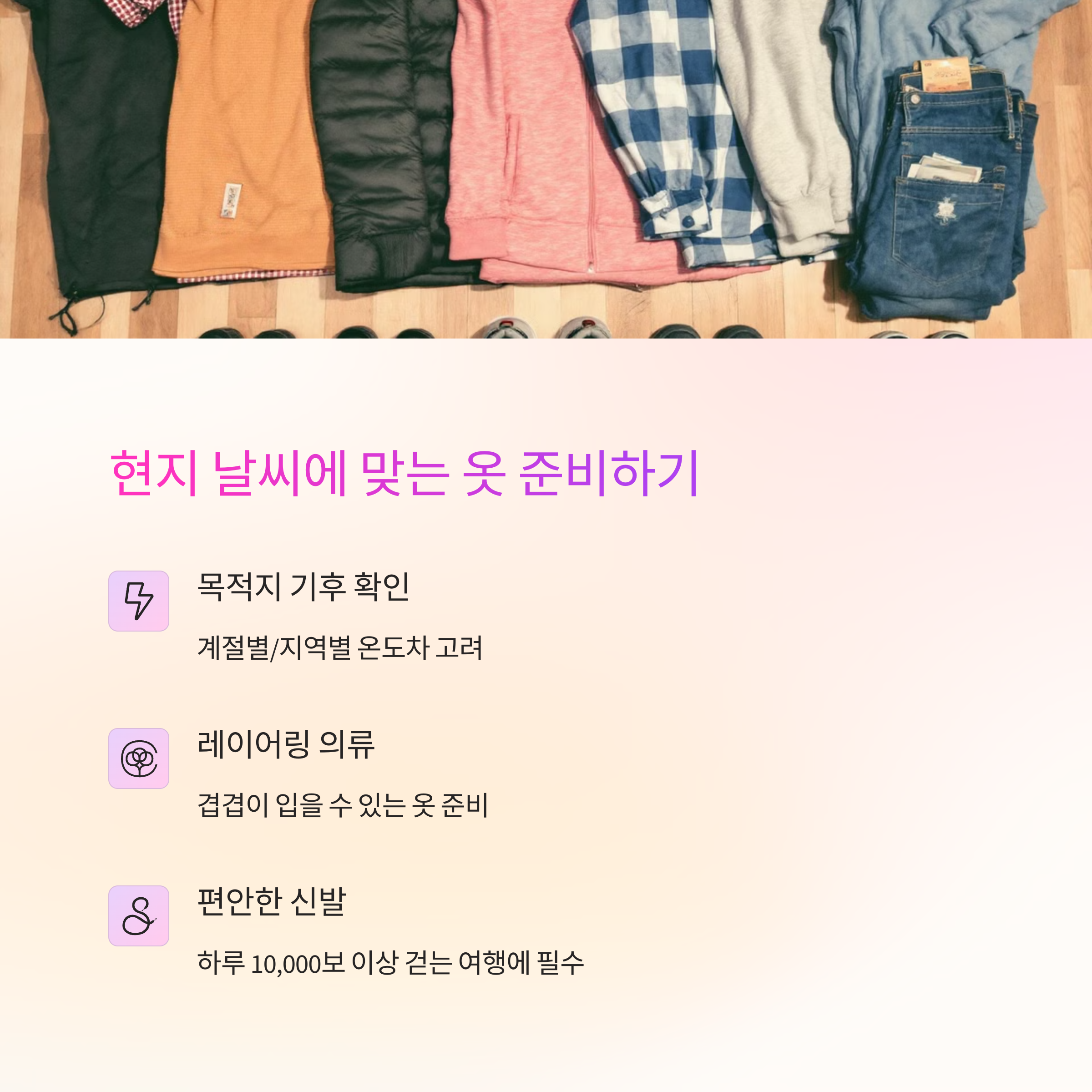 | 어댑터, 충전기, 보조배터리 등 필수 품목 | 날씨와 장소에 맞춘 복장 및 편한 운동화 | 액체 규정, 면도기 등 기내 반입 제한 확인 |