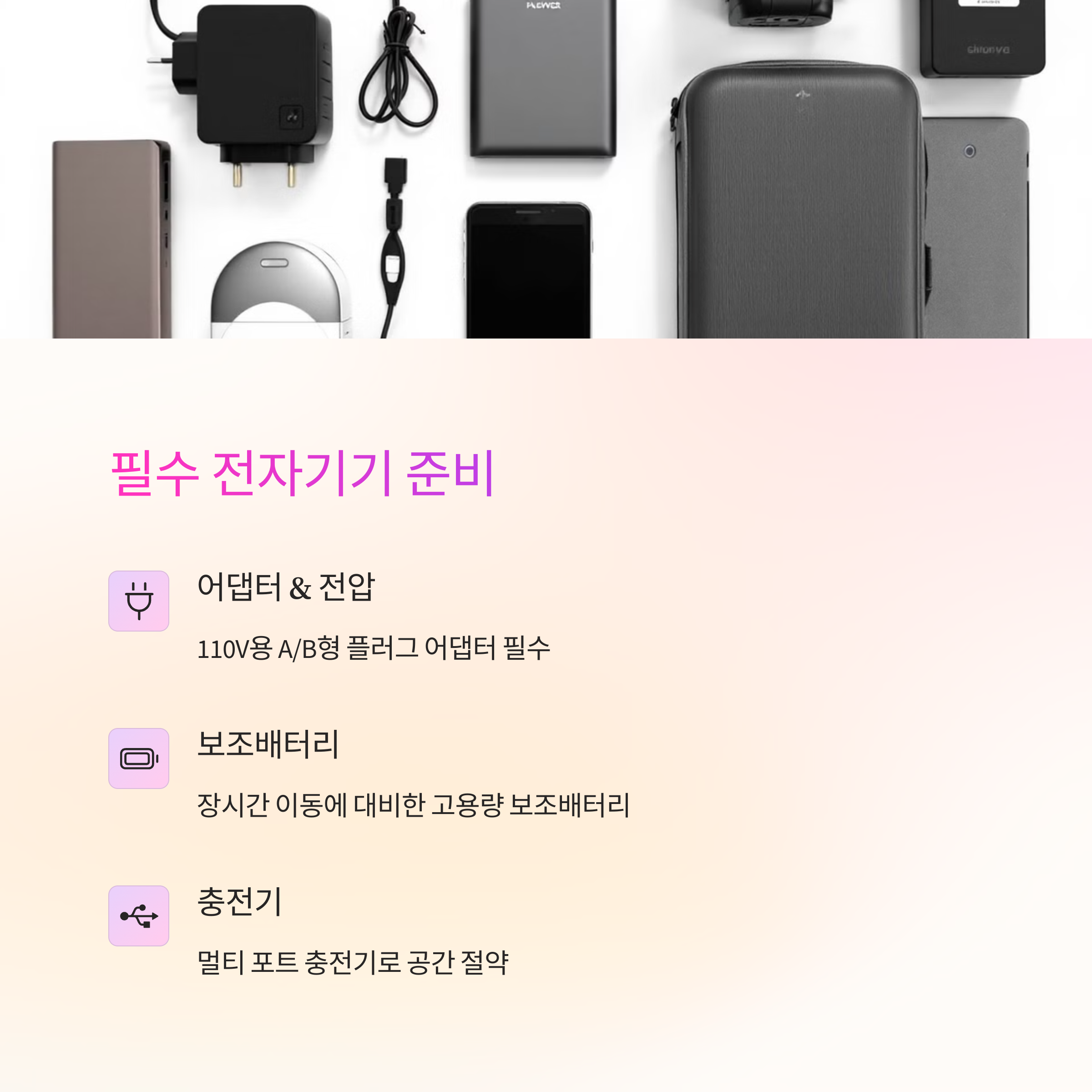 | 필수 전자기기 | 어댑터, 보조배터리, 충전기 등은 필수 준비물입니다. |