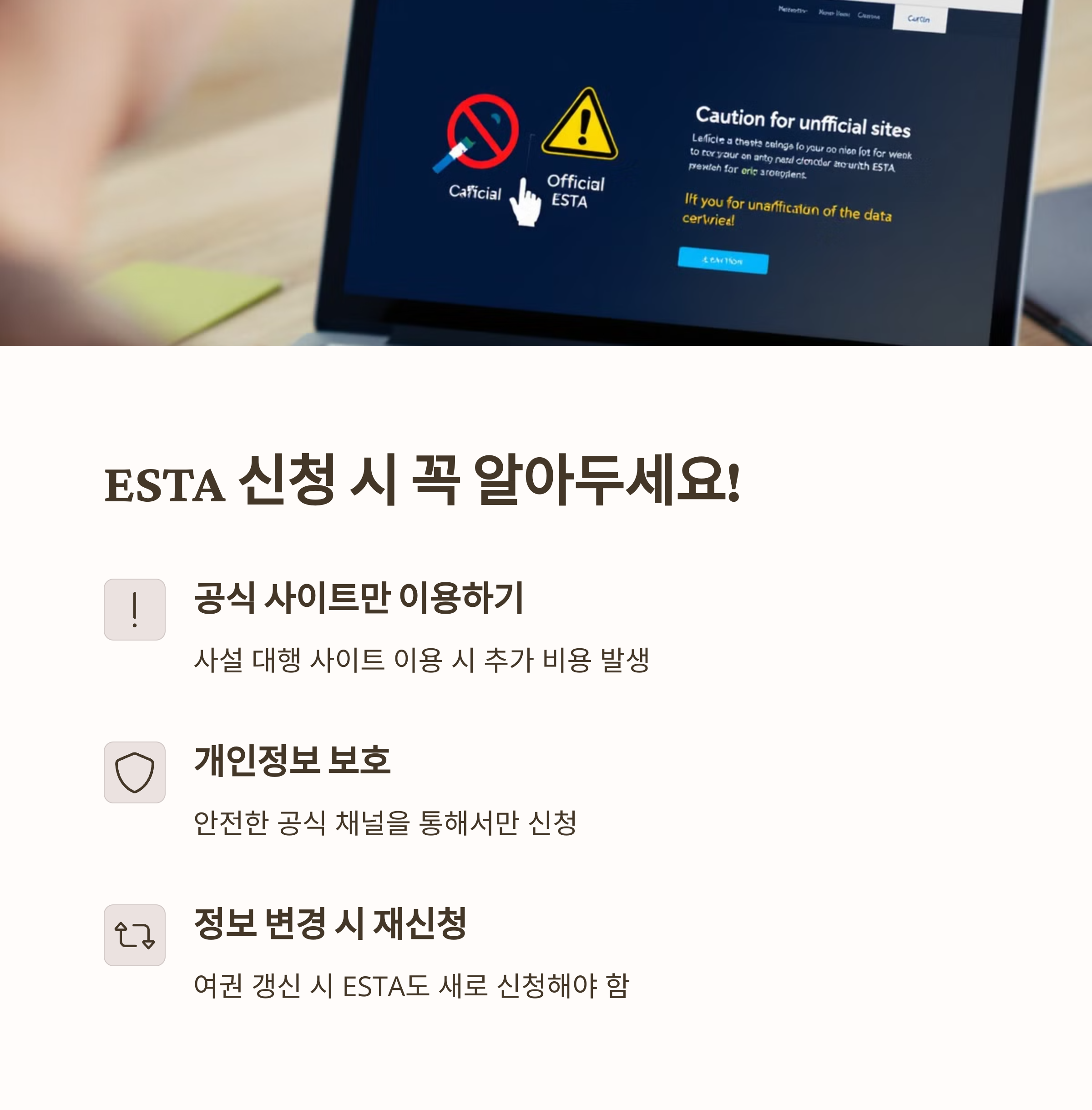 미국 여행을 계획하고 있다면 ESTA 신청을 잊지 마세요! 온라인으로 간편하게 신청할 수 있지만, 가짜 사이트에 속지 않도록 주의해야 합니다. ESTA는 2년 동안 유효하며, 여권이 만료되면 ESTA도 자동으로 만료됩니다. 여행을 앞두고 있다면 지금 바로 신청하세요!