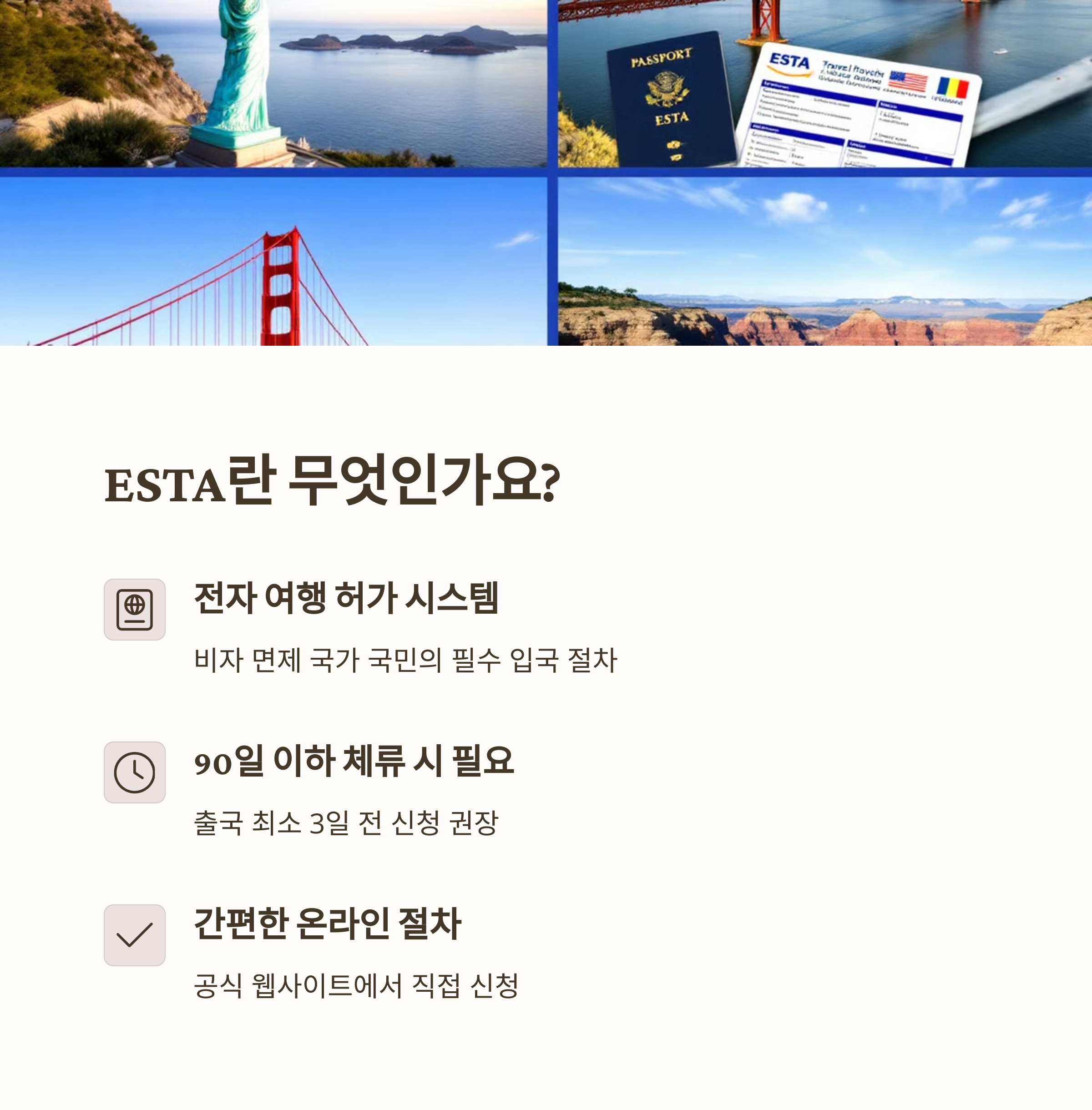 ESTA(전자 여행 허가)는 미국 여행을 계획하는 비자 면제 국가 국민에게 필수적인 입국 절차입니다. ESTA가 없으면 미국행 항공편에 탑승할 수 없으므로 반드시 출국 전에 신청해야 합니다.